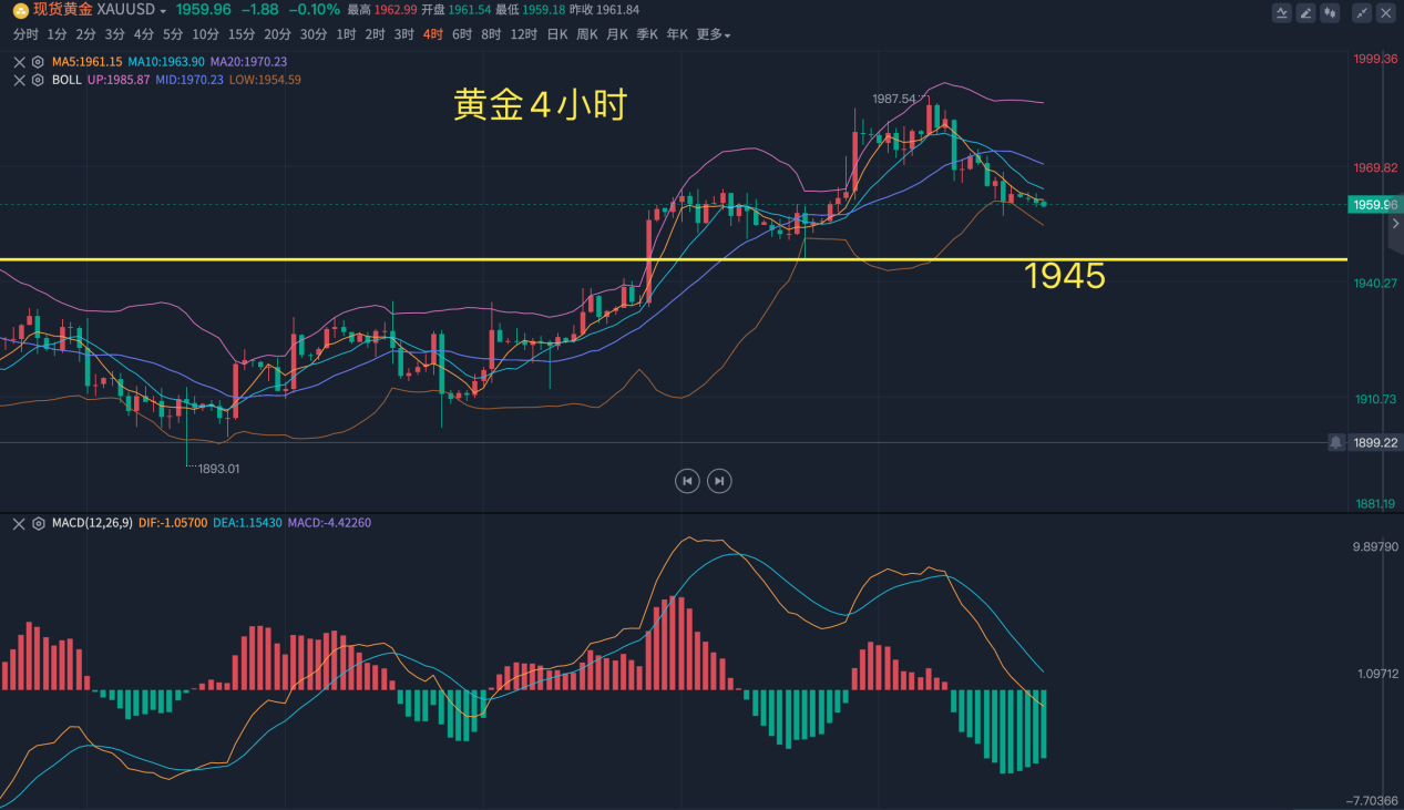 上图,金价自1985一直下滑,上周五我还是比较看好1960的支撑位置,当时并没有计划去追多,但回撤多肯定是过于激进了,我虽然偏执,但不固执,最终还是计划在1960再入场多,结果这进去在这就卡住不动了,1945的位置视力只要没问题都知道是支撑点,这是上涨1985的支撑位置,这里失守了,那再谈做多就有点上头了,今天亚欧盘还有延续的空间,周线方面向下空间不会太大,主打一个震荡,所以,手里上周五有1960多的兄弟们,就再忍忍先拿着,空仓的等着下探1955-52的区域再进场,记着,1945是底牌,这一次只要有反扑,就得来个吞没上周五高点的大阳。
