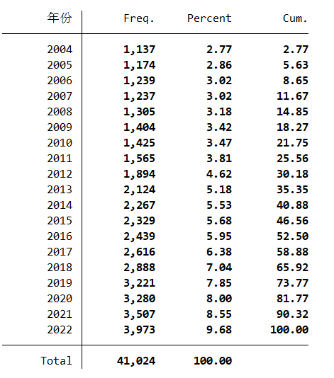 样本处理:删除数据缺失的样本;删除资产负债率大于1的样本;删除ST类样本;删除归属于金融和房地产行业样本。
