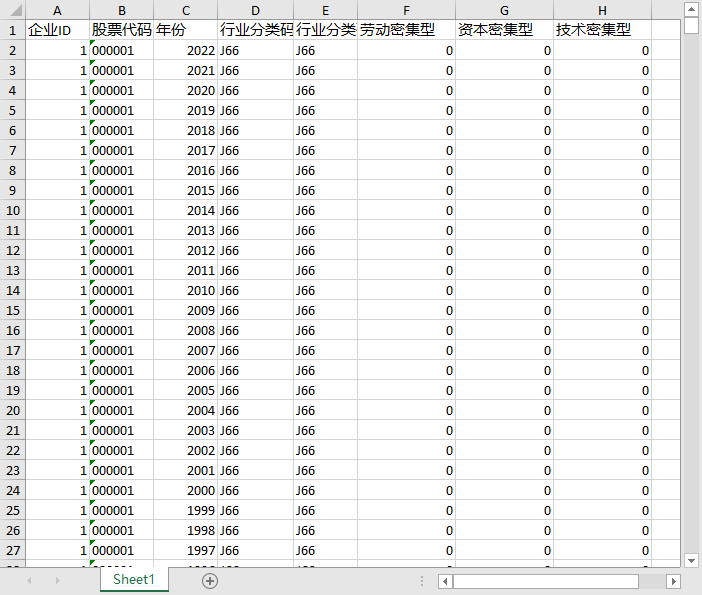 企业ID 股票代码 年份 行业分类码 行业分类码 劳动密集型 资本密集型 技术密集型