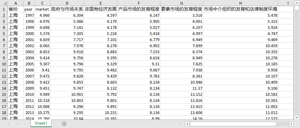 市面上的数据大多是根据樊纲中国市场化指数报告得到1997-2019年的数据,然后外推得到未披露信息年度的数据。 中国分省份市场化指数数据官网中表明,由于纸质版报告每隔几年会更换一次指数计算的基期年份,导致不同年份报告提供的不同基期指数不具有直接可比性。所以,在进行跨年度分析时,建议使用数据中提供的跨年度可比指数。因此,2019年之前的市场化指数数据应采用中国市场化指数数据中的数据。 由于外部治理环境发展具有持续性和稳定性,所以用历年数据的年平均增长幅度来预测未披露信息年度的数据(2020-2023年)。