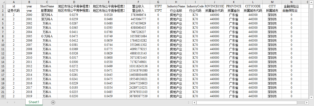 证券代码 year 股票简称 地区市场公平竞争程度1 地区市场公平竞争程度2 营业收入 STPT 行业名称 行业代码 所属省份代码 所属省份 所属城市代码 所属城市 金融保险业