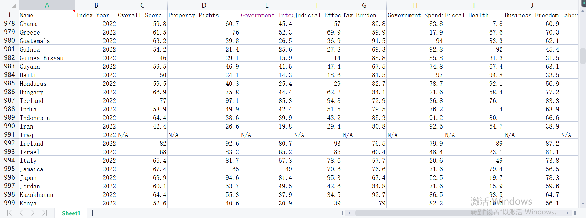 统计世界各个国家和地区,具体统计指标为 Name Index Year Overall Score Property Rights Government Integrity Judicial Effectiveness Tax Burden Government Spending Fiscal Health Business Freedom Labor Freedom Monetary Freedom Trade Freedom Investment Freedom Financial Freedom