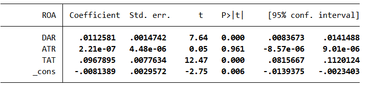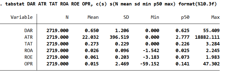 以我国房地产行业上市公司为研究对象,研究杠杆率与经营绩效之间的作用关系;参考各类文献,结合房地产上市公司债务融资特征,选取资产负债率(DAR)作为债务融资结构方面的解释变量。被解释变量 Y 选取净资产收益率(ROE)、总资产净利润率(ROA)、营业利润率(OPR)作为经营绩效的衡量指标。并且根据相关文献的研究方法,将总资产周转率(TAT)、应付账款周转率(ATR)作为控制变量。