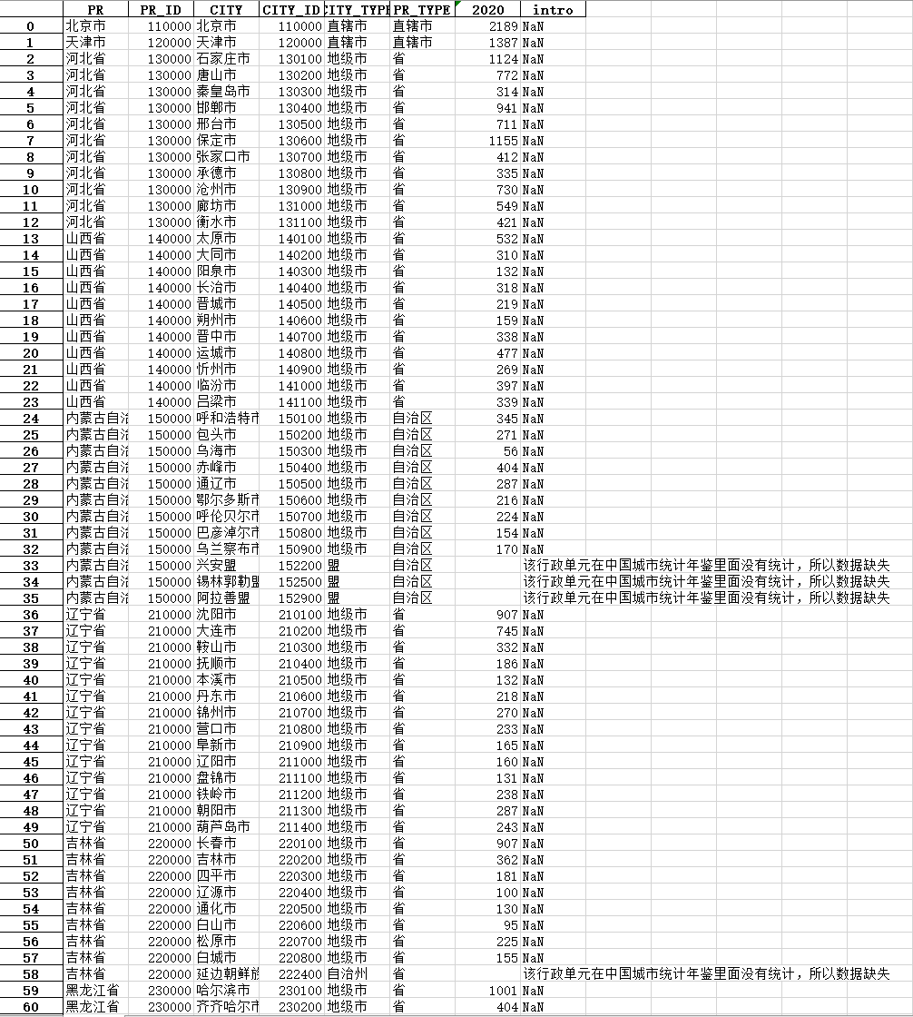 一、《中国城市统计年鉴》统计的是城市的数据,非城市的行政单元和非地级及以上的行政单元没有统计在内,一共有74个,具体为:兴安盟、锡林郭勒盟、阿拉善盟、延边朝鲜族自治州、大兴安岭地区、济源市、恩施土家族苗族自治州、仙桃市、潜江市、天门市、神农架林区、湘西土家族苗族自治州、五指山市、琼海市、文昌市、万宁市、东方市、定安县、屯昌县、澄迈县、临高县、白沙黎族自治县、昌江黎族自治县、乐东黎族自治县、陵水黎族自治县、保亭黎族苗族自治县、琼中黎族苗族自治县、阿坝藏族羌族自治州、甘孜藏族自治州、凉山彝族自治州、黔西南布依族苗族自治州、黔东南苗族侗族自治州、黔南布依族苗族自治州、楚雄彝族自治州、红河哈尼族彝族自治州、文山壮族苗族自治州、西双版纳傣族自治州、大理白族自治州、德宏傣族景颇族自治州、怒江傈僳族自治州、迪庆藏族自治州、阿里地区、临夏回族自治州、甘南藏族自治州、海北藏族自治州、黄南藏族自治州、海南藏族自治州、果洛藏族自治州、玉树藏族自治州、海西蒙古族藏族自治州、昌吉回族自治州、博尔塔拉蒙古自治州、巴音郭楞蒙古自治州、阿克苏地区、克孜勒苏柯尔克孜自治州、喀什地区、和田地区、伊犁哈萨克自治州、塔城地区、阿勒泰地区、石河子市、阿拉尔市、图木舒克市、五家渠市、北屯市、铁门关市、双河市、可克达拉市、昆玉市、胡杨河市、新星市、台湾省、香港特别行政区、澳门特别行政区。