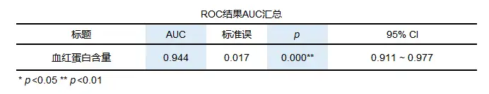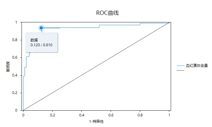 从结果可以看出血红蛋白含量对应的AUC值为0.944,大于0.9,所以说明诊断价值高,并且从p值也能看出,p值小于0.05,说明血红蛋白含量对应的AUC值明显高于0.5。接下来进行查看最佳界值。
