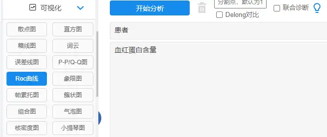 ROC曲线分析路径为点击【可视化】→【ROC曲线】然后进行分析: