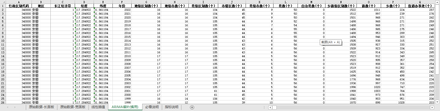 excel数据文件包原始数据-长面板(由于多年度指标不同存在缺失值)、原始数据-宽面板(由于多年度指标不同存在缺失值)、线性插值、ARIMA填补四个版本,提供您参考使用。