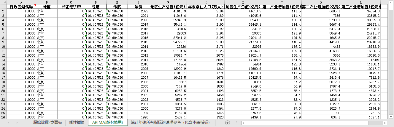 excel数据文件包原始数据-宽面板(由于多年度指标不同存在缺失值)、线性插值、ARIMA填补三个版本,提供您参考使用。