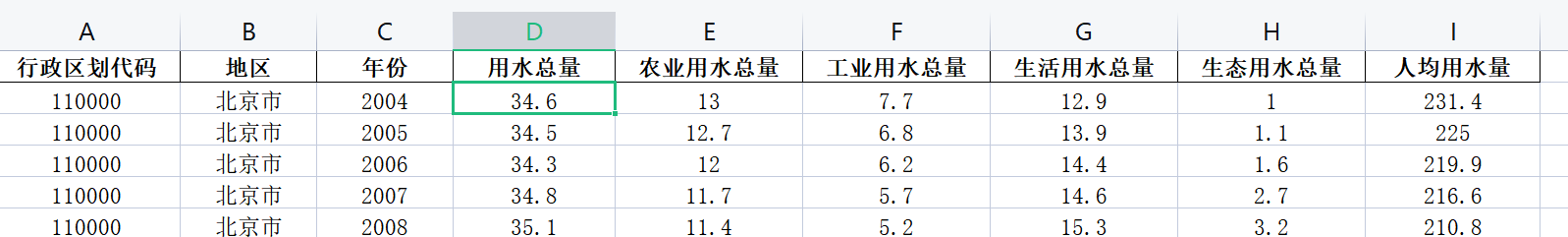 分省用水量等数据2003-2020指标包括:用水总量 农业用水总量 工业用水总量 生活用水总量 生态用水总量 人均用水量