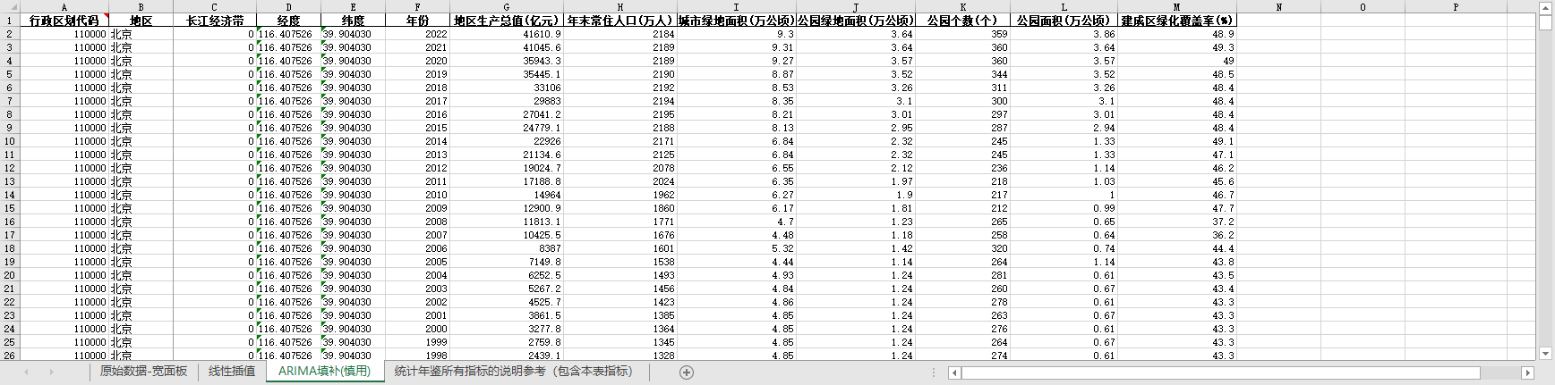 excel数据文件包原始数据-宽面板(由于多年度指标不同存在缺失值)、线性插值、ARIMA填补三个版本,提供您参考使用。