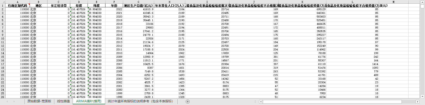 excel数据文件包原始数据-宽面板(由于多年度指标不同存在缺失值)、线性插值、ARIMA填补三个版本,提供您参考使用。