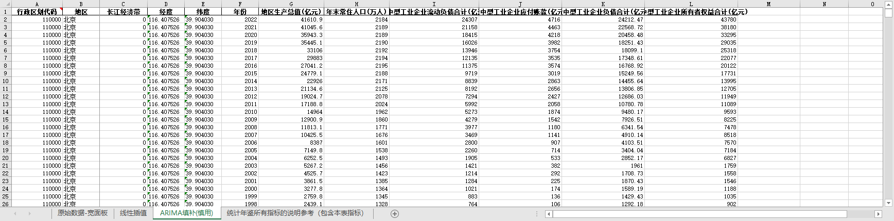 excel数据文件包原始数据-宽面板(由于多年度指标不同存在缺失值)、线性插值、ARIMA填补三个版本,提供您参考使用。