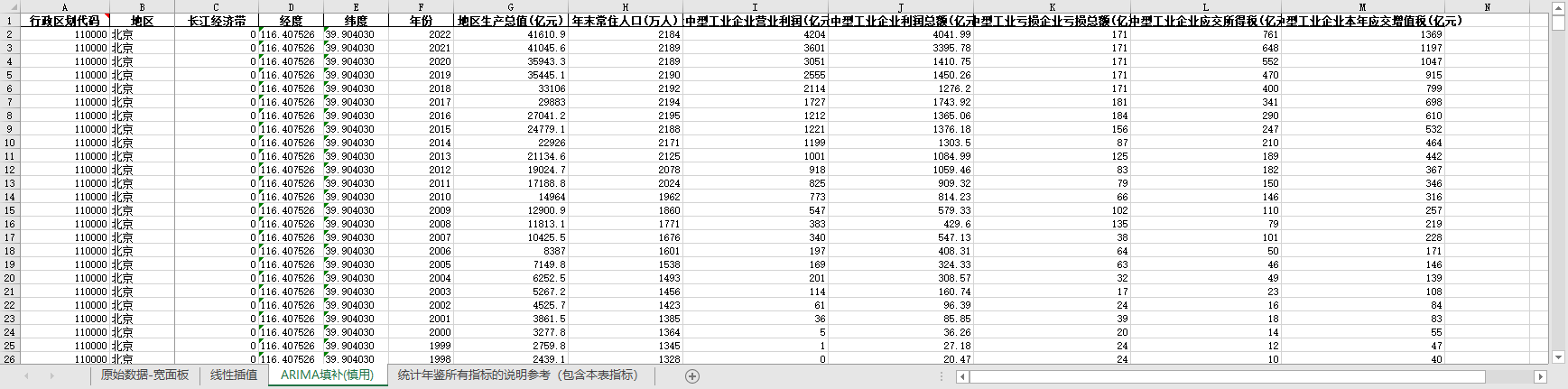 excel数据文件包原始数据-宽面板(由于多年度指标不同存在缺失值)、线性插值、ARIMA填补三个版本,提供您参考使用。