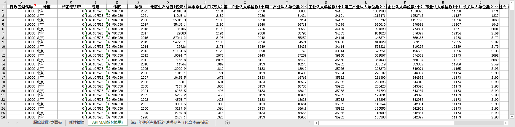 excel数据文件包原始数据-宽面板(由于多年度指标不同存在缺失值)、线性插值、ARIMA填补三个版本,提供您参考使用。
