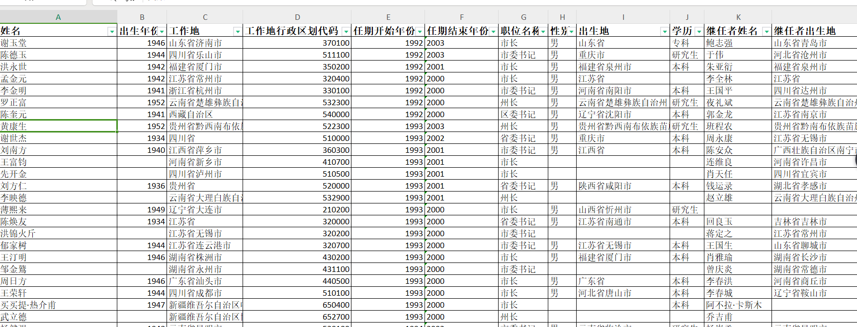 | 姓名 | 出生年份 | 工作地 | 工作地行政区划代码 | 任期开始年份 | 任期结束年份 | 职位名称 | 性别 | 出生地 | 学历 | 继任者姓名 | 继任者出生地 |