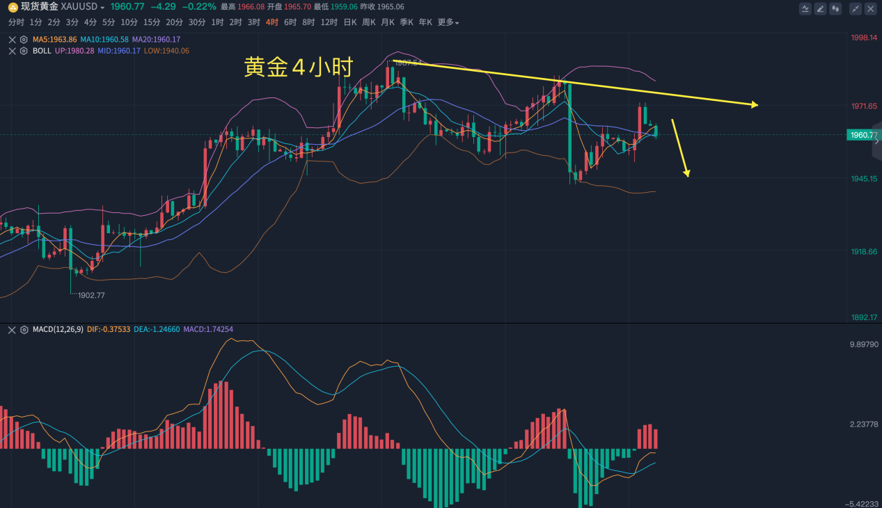 周一,金价经过整理之后向上突破,过了1965的压力位,测试了1972的高点,周线方面处于boll中轨位置的夹角之内,短线仍然保持着区间的震荡行情,这周非农数据才是关键所在,现在来看4小时,也是宽幅的震荡行情,亚欧盘以回落修正为主,美盘再以反弹为主,单边的行情可能会推迟到周四,五的时间节点,同时,要关注美元的反弹情况。