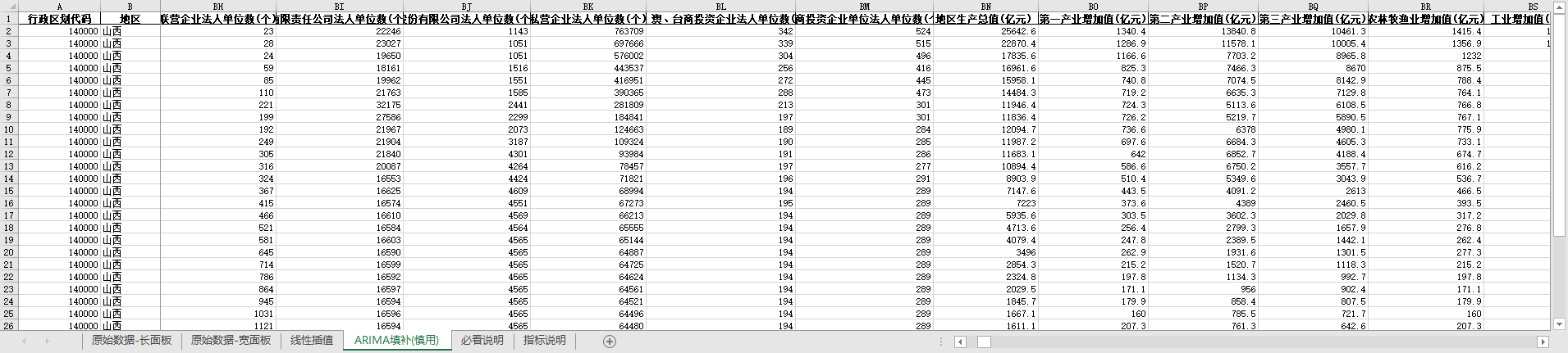 excel数据文件包原始数据-长面板(由于多年度指标不同存在缺失值)、原始数据-宽面板(由于多年度指标不同存在缺失值)、线性插值、ARIMA填补四个版本,提供您参考使用。