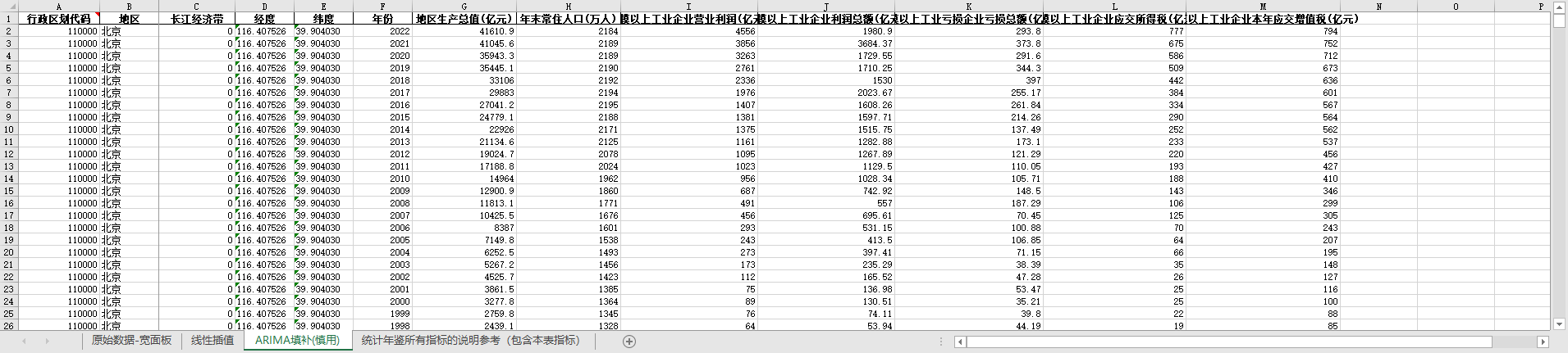 excel数据文件包原始数据-宽面板(由于多年度指标不同存在缺失值)、线性插值、ARIMA填补三个版本,提供您参考使用。