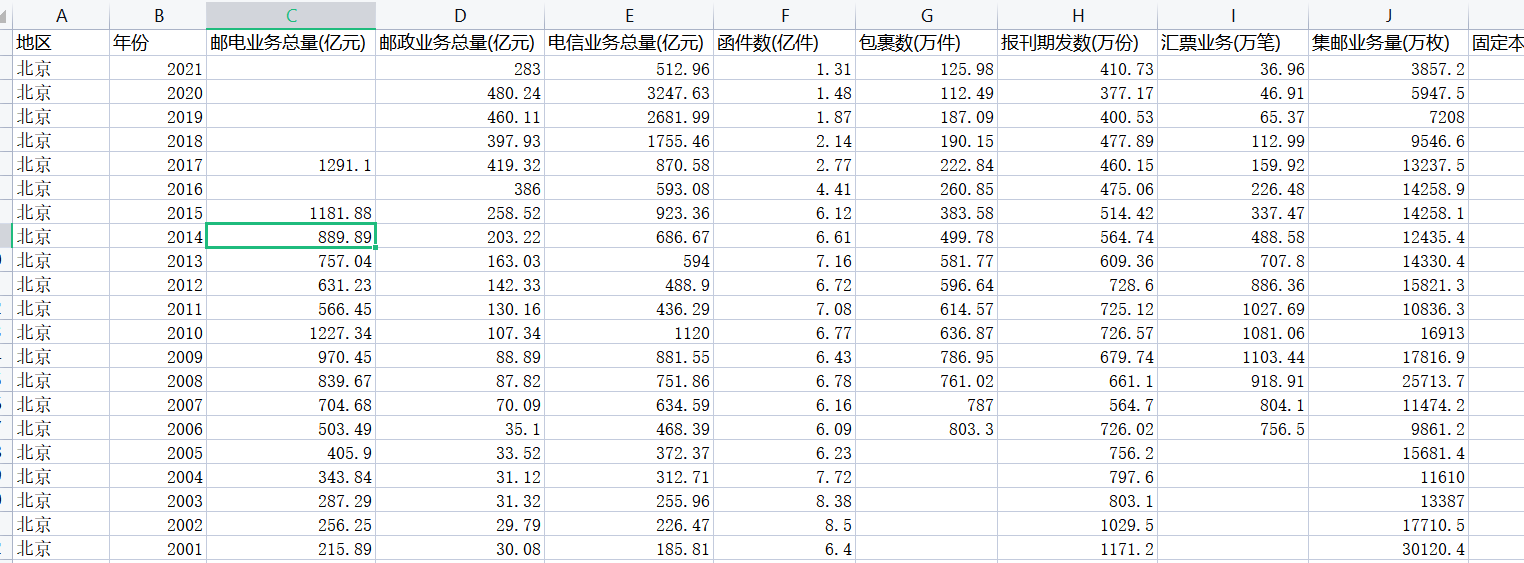 地区、年份、邮电业务总量(亿元)、邮政业务总量(亿元)、电信业务总量(亿元)、函件数(亿件)、包裹数(万件)、报刊期发数(万份)、汇票业务(万笔)、集邮业务量(万枚)、固定本地电话通话时长(万分钟)、固定长途电话通话时长(万分钟)、移动短信业务量(亿条)、移动电话通话时长(万分钟)、移动电话去话通话时长(万分钟)、移动电话非漫游去话通话时长(万分钟)、移动电话国内漫游去话通话时长(万分钟)、移动电话国际及港澳台漫游去话通话时长(万分钟)、移动电话年末用户(万户)、3G移动电话用户(万户)、固定电话年末用户(万户)、城市电话年末用户数(万户)、城市住宅电话年末用户数(万户)、农村电话年末用户数(万户)、农村住宅电话年末用户数(万户)、公用电话用户(万户)
