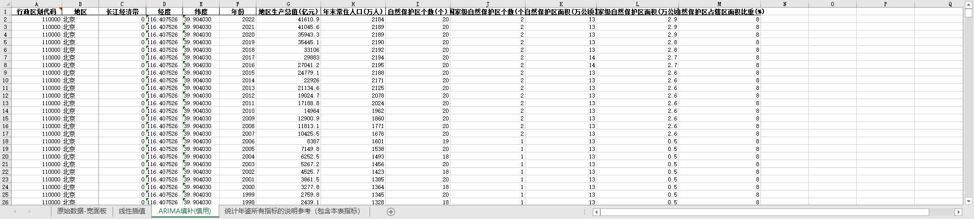 excel数据文件包原始数据-宽面板(由于多年度指标不同存在缺失值)、线性插值、ARIMA填补三个版本,提供您参考使用。