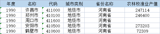指标包含:年度 、名称、 代码、 城市类别、 省份名称、 农林牧渔业产值、 土地面积 、建成区土地面积、 年末实有耕地面积 、人均耕地面积、 猪牛羊肉产量、 水产品产量 、城市蔬菜产量 、城市水果产量 、人均猪牛羊肉产量 、人均牛羊奶产量 、人均禽肉产量 、人均禽蛋产量 、人均水产品产量、 人均蔬菜产量。