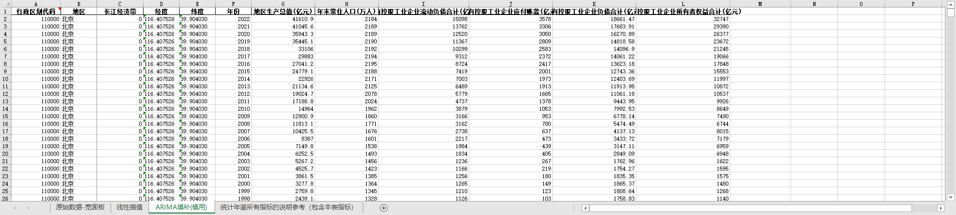 excel数据文件包原始数据-宽面板(由于多年度指标不同存在缺失值)、线性插值、ARIMA填补三个版本,提供您参考使用。