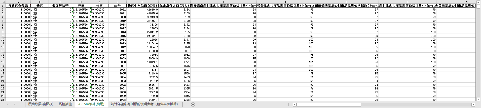 excel数据文件包原始数据-宽面板(由于多年度指标不同存在缺失值)、线性插值、ARIMA填补三个版本,提供您参考使用。