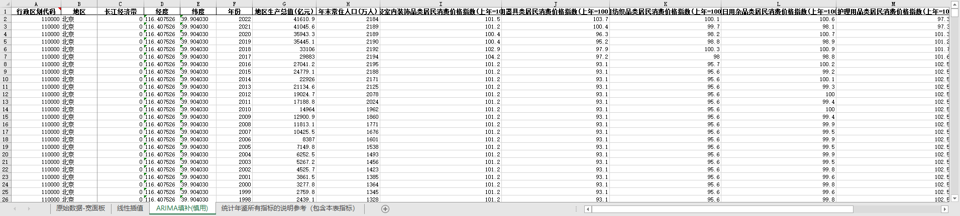 excel数据文件包原始数据-宽面板(由于多年度指标不同存在缺失值)、线性插值、ARIMA填补三个版本,提供您参考使用。