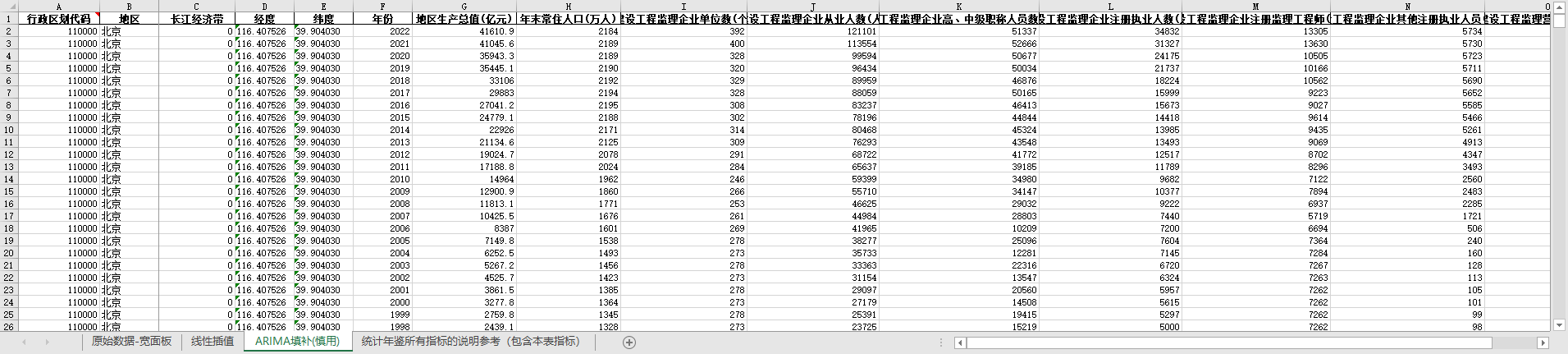 excel数据文件包原始数据-宽面板(由于多年度指标不同存在缺失值)、线性插值、ARIMA填补三个版本,提供您参考使用。