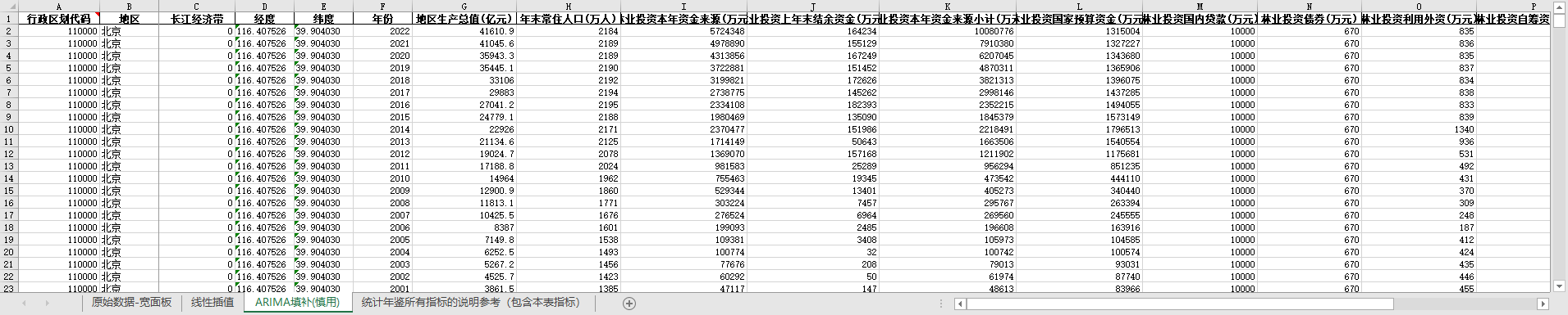 excel数据文件包原始数据-宽面板(由于多年度指标不同存在缺失值)、线性插值、ARIMA填补三个版本,提供您参考使用。