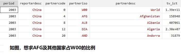 想求各国贸易额占世界的比例,但是世界是和其他国家一样作为其中一个ID存在的,如下图,想生成一列各年的世界总额数据,这样求比例直接除就可以了,这个怎么弄呢?