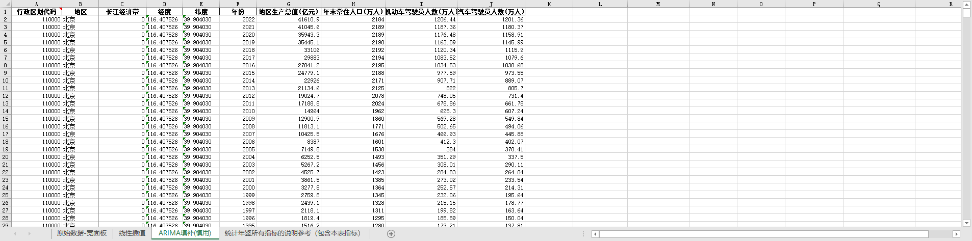 excel数据文件包原始数据-宽面板(由于多年度指标不同存在缺失值)、线性插值、ARIMA填补三个版本,提供您参考使用。