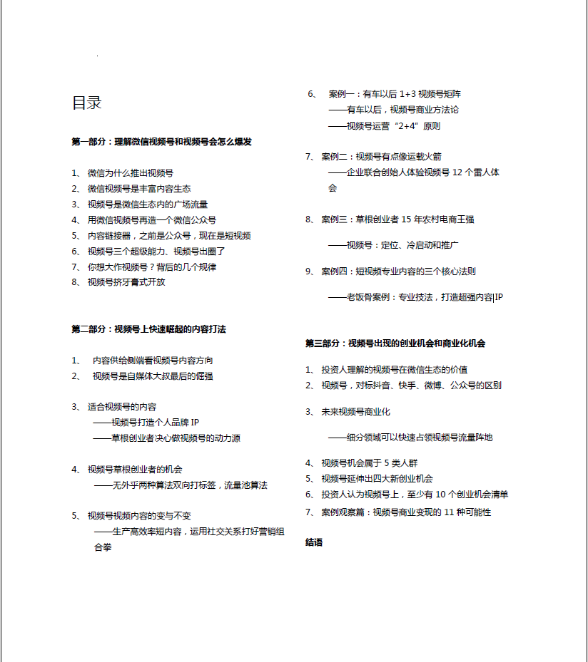 《视频号新机遇》白皮书 自媒体与业内人士看法整合。(1.50mb)总共3部分:理解微信视频号和视频号会怎么爆发、视频号上快速崛起的内容打法、视频号出现的创业机会和商业化机会。