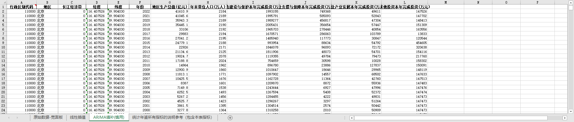 excel数据文件包原始数据-宽面板(由于多年度指标不同存在缺失值)、线性插值、ARIMA填补三个版本,提供您参考使用。