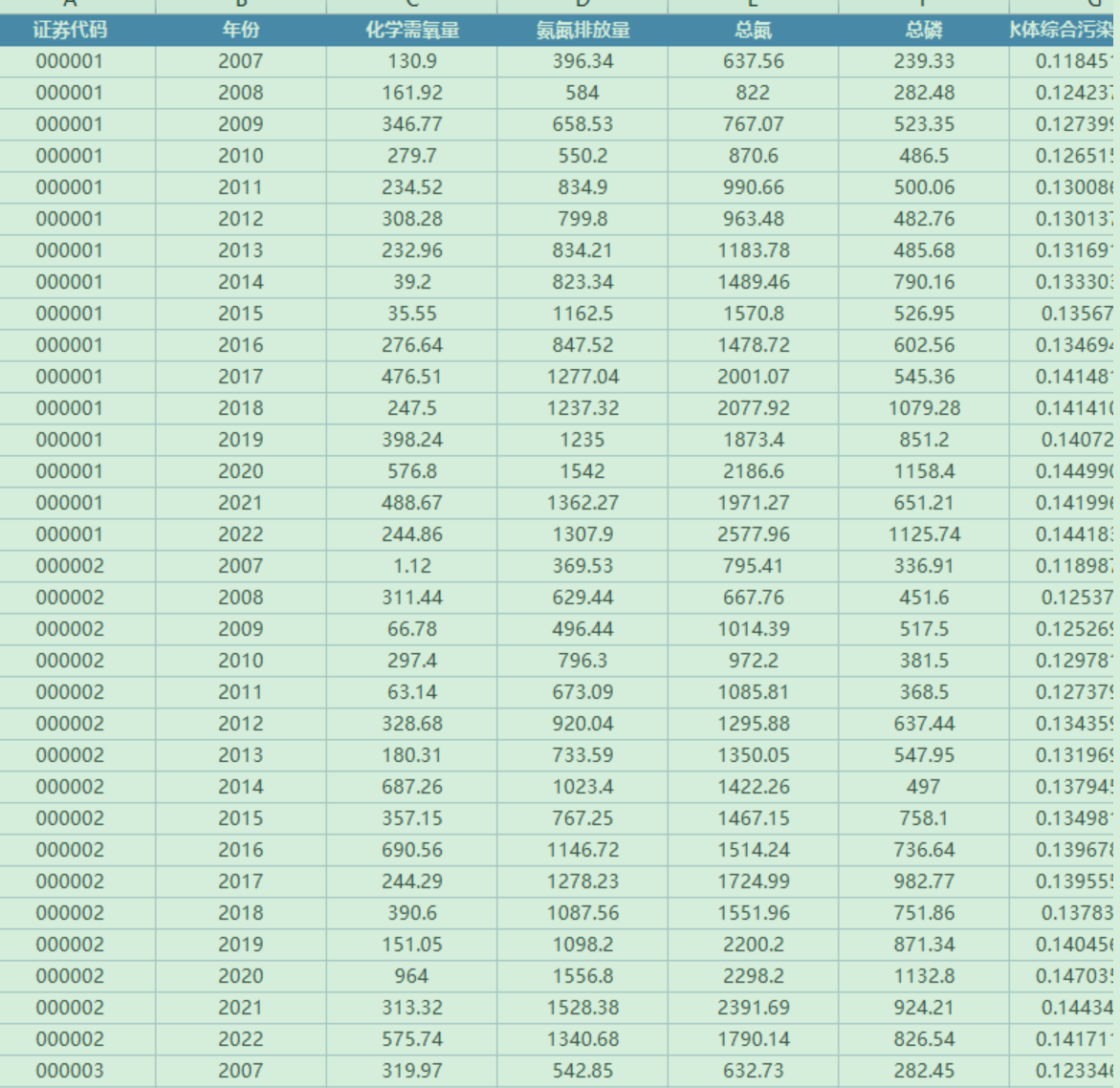 证券代码、年份、化学需氧量、氨氮排放量、总氮、总磷、水体综合污染当量对数、二氧化硫、氮氧化物、烟尘、空气综合污染当量对数、总污染当量对数