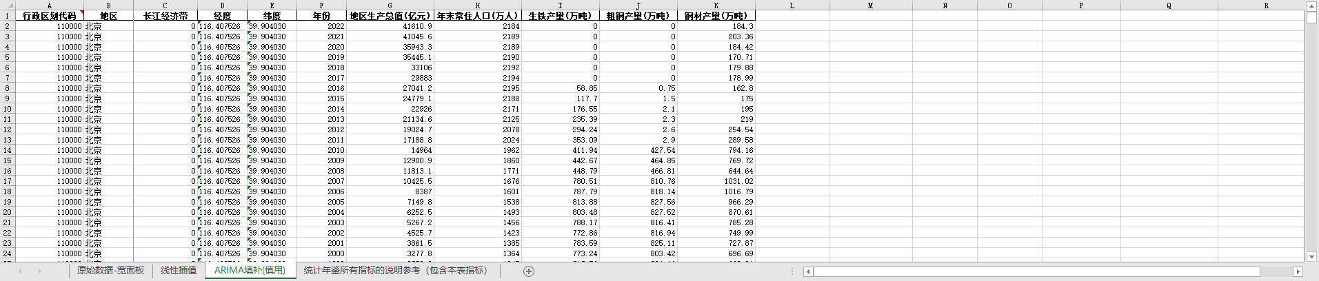 excel数据文件包原始数据-宽面板(由于多年度指标不同存在缺失值)、线性插值、ARIMA填补三个版本,提供您参考使用。