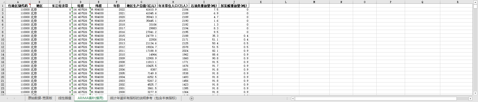 excel数据文件包原始数据-宽面板(由于多年度指标不同存在缺失值)、线性插值、ARIMA填补三个版本,提供您参考使用。