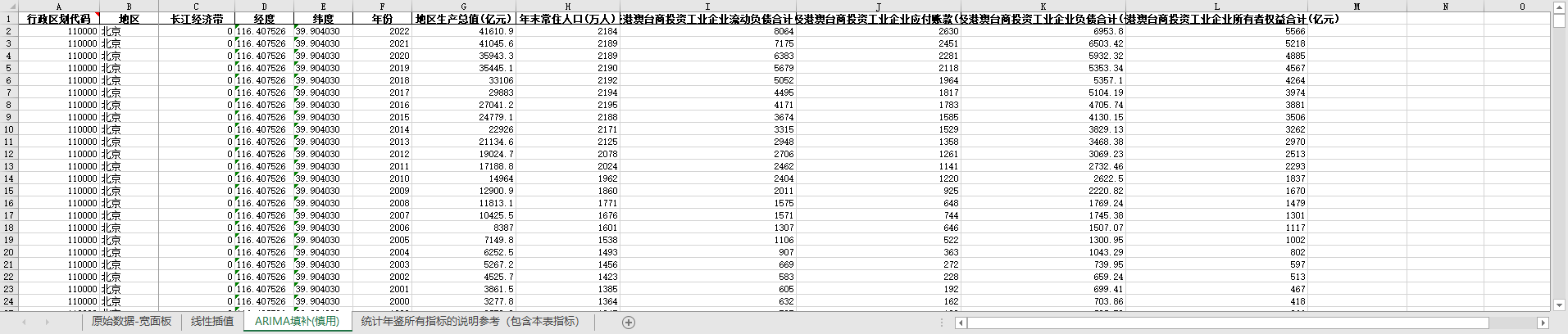excel数据文件包原始数据-宽面板(由于多年度指标不同存在缺失值)、线性插值、ARIMA填补三个版本,提供您参考使用。