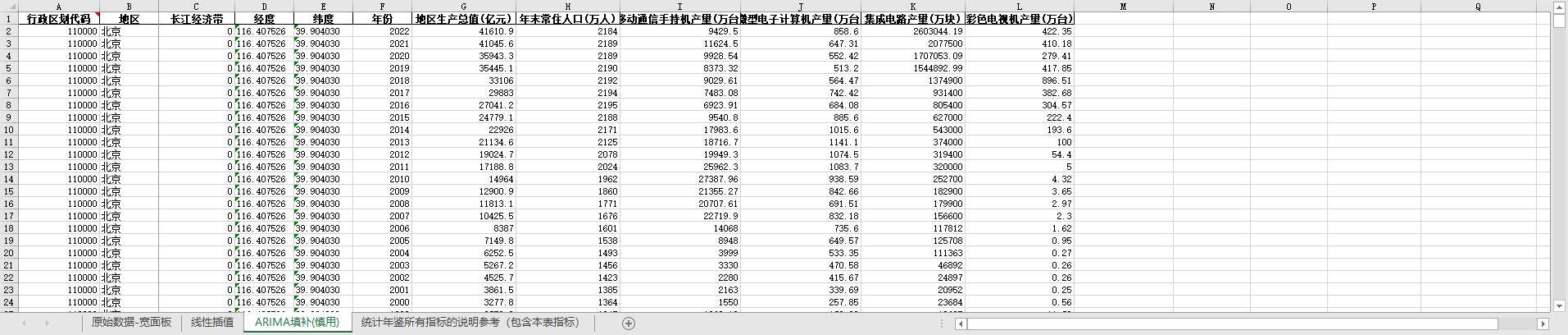 excel数据文件包原始数据-宽面板(由于多年度指标不同存在缺失值)、线性插值、ARIMA填补三个版本,提供您参考使用。