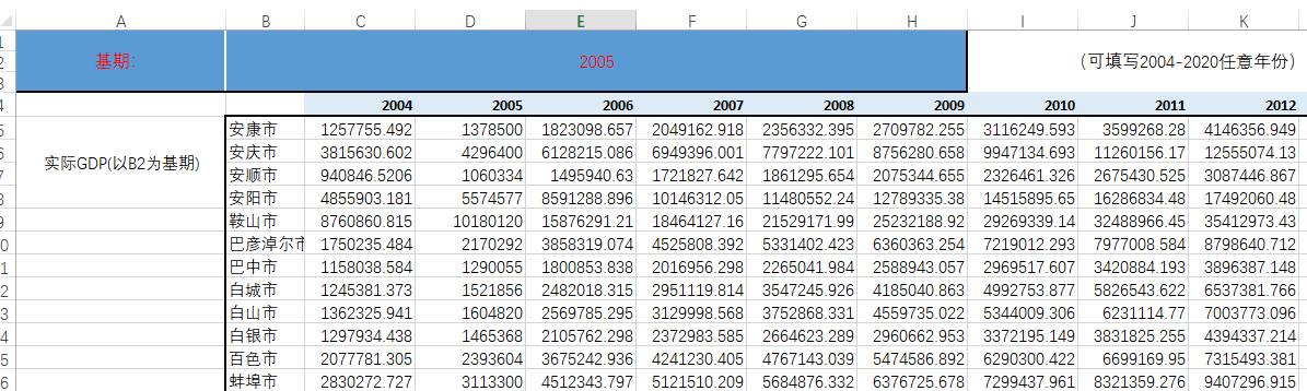 目前,网上流传的我国地级市实际GDP测算步骤及结果含糊不清,且无固定模板,不能根据实际需要切换基期,在导师的指导和帮助下,我花费大量时间收集、整理,参考权威文献测算了这份独家发布、原创整理的2004-2020年我国地级市实际GDP计算模板,可以通过手动输入确定2004-2020年任意一年为基期,并可根据实际需要删减或增加城市以及更新数据年份,附赠2004-2020年我国286个地级市的名义GDP以及GDP指数。
