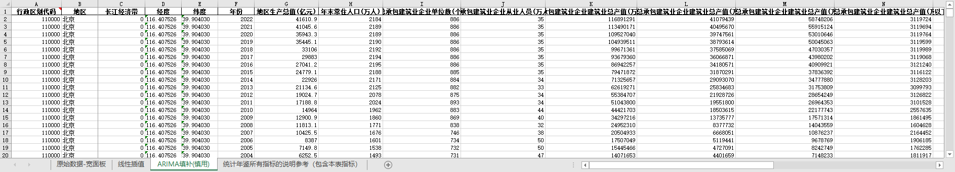 excel数据文件包原始数据-宽面板(由于多年度指标不同存在缺失值)、线性插值、ARIMA填补三个版本,提供您参考使用。