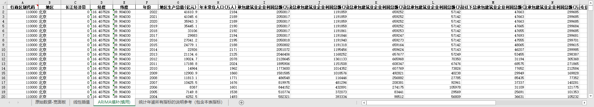 excel数据文件包原始数据-宽面板(由于多年度指标不同存在缺失值)、线性插值、ARIMA填补三个版本,提供您参考使用。