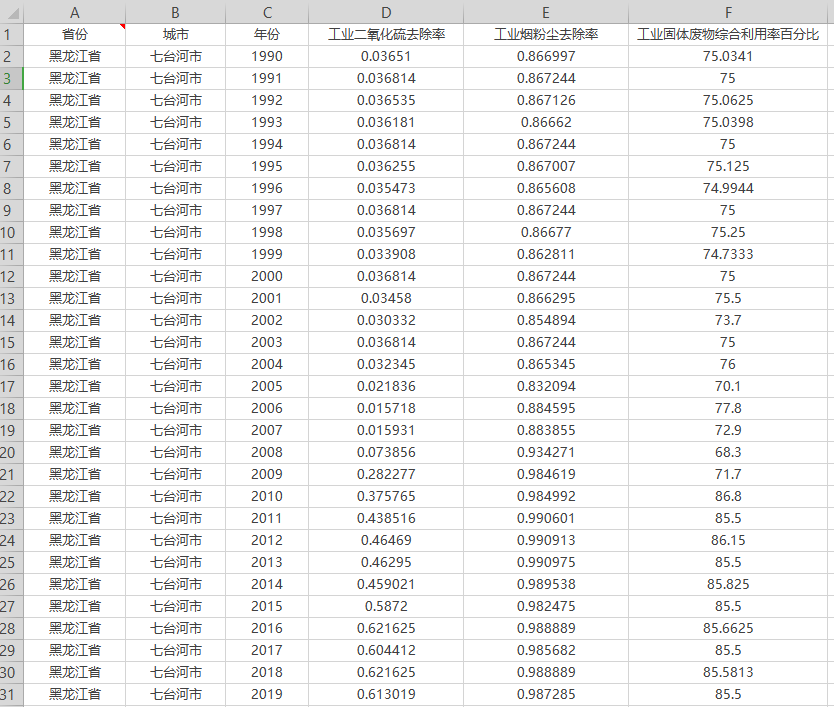 数据名称:全国各地级市工业废气SO2、废物、废水、粉尘去除率