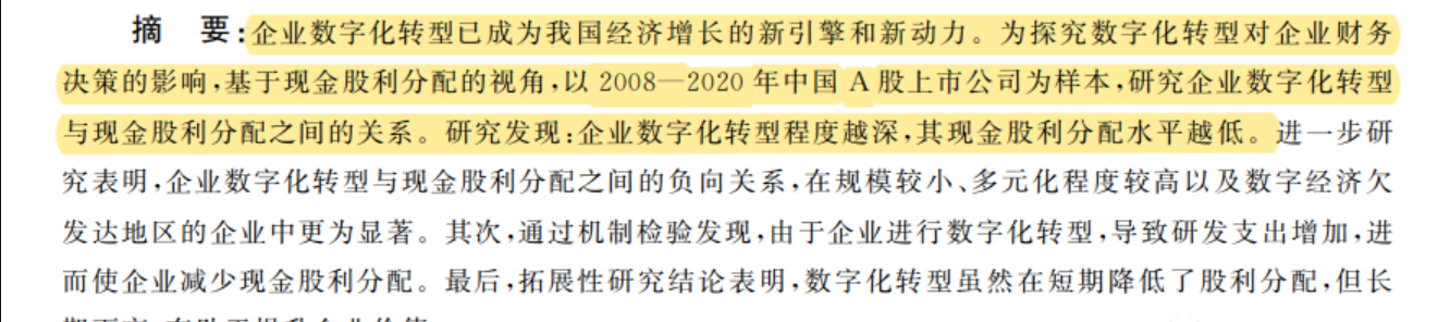 参考文献:李滟,李金嶽,刘向强.企业数字化转型与股利分配[J].西南大学学报(社会科学版),2023,49(02):114-126.