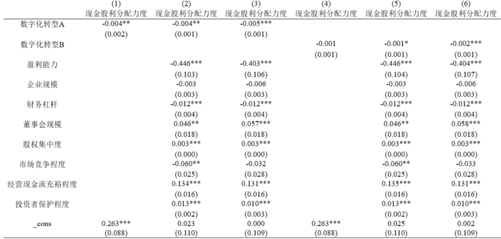 参照李滟(2023)的做法,本团队对来自西南大学学报(社会科学版)《企业数字化转型与股利分配》一文中的基准回归部分进行复刻。