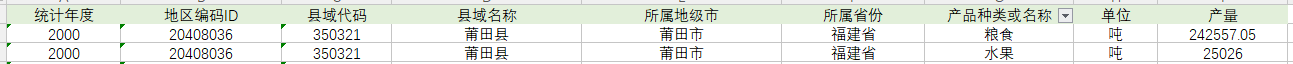 指标包含:统计年度、 地区编码ID 、县域代码 、县域名称、 所属地级市 、所属省份 、产品种类或名称、 单位、 产量。