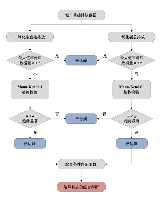 而根据我搜集到的资料(如下图2),只看到了如何以MK趋势分析判断是否碳达峰,且单纯以MK法判断的结论与上图给出的结论并不一致,如何结合MK趋势分析和Tapio脱钩指数两个方面的分析结果来判断是否实现碳达峰,这个问题一直没找到答案。