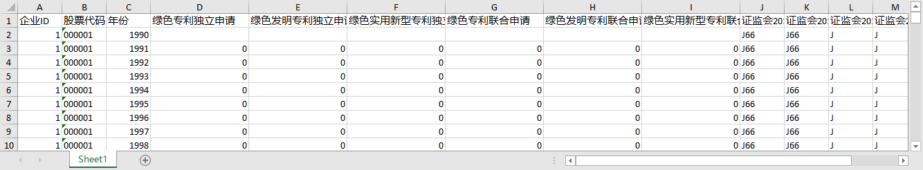企业ID 股票代码 年份 绿色专利独立申请 绿色发明专利独立申请 绿色实用新型专利独立申请 绿色专利联合申请 绿色发明专利联合申请 绿色实用新型专利联合申请 证监会2012行业大类分类码-每年更新 证监会2012行业大类分类码-每年更新 证监会2012行业门类分类码-每年更新 证监会2012行业门类分类码-每年更新 重污染行业企业