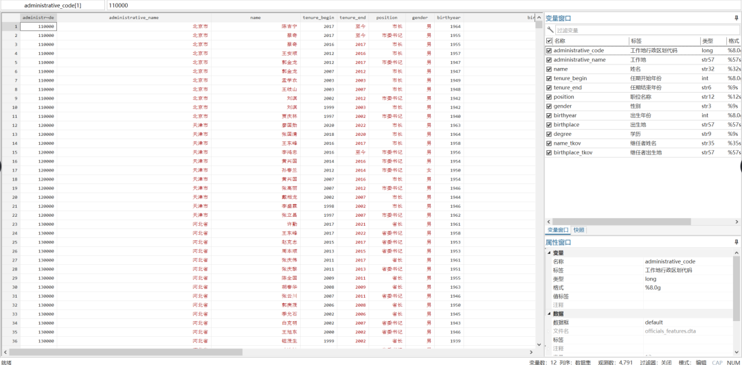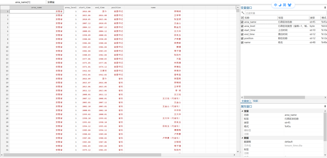 今天为大家整理了一份1945-2020年间官员任期与1992-2022年间省级行政区官员特征数据重磅合集,涵盖行政区划代码、行政区名称、姓名、任期开始年、任期结束年、职务、性别、出生年份、出生地等指标,供读者进行科研使用。