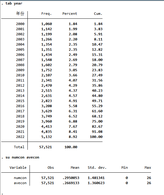 方法:复刻了雷雷等(2023)在《经济研究》的做法,取年度最大值作为年度指标。文献具体没有说明季度层面的Numcon和Avgcon怎么转换为年度层面。取当年的最大值作为年度指标,例如1季度的Numcon值为2,4季度的Numcon值为4,则当年Numcon值为4。